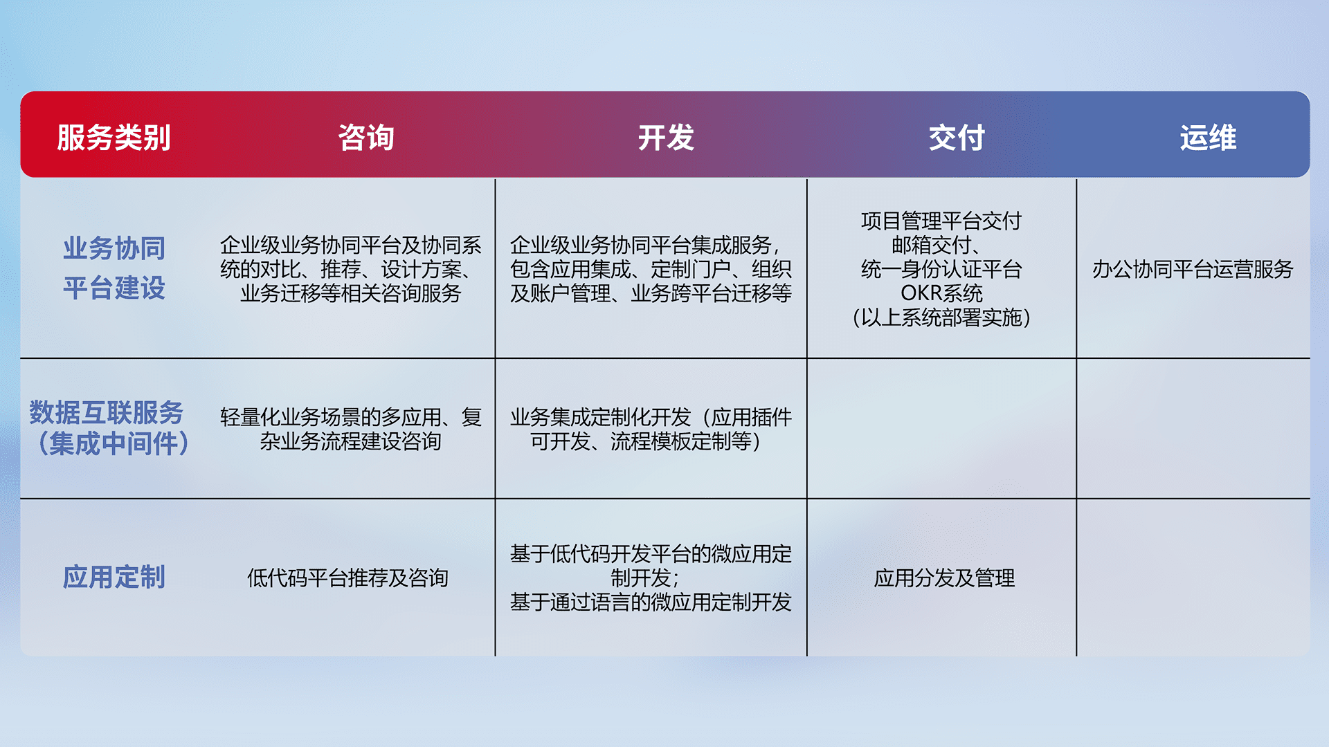 针对钉钉、、企微、、、IDaas等平台级产品提供产品的规划、、、方案、、、、交付、、、、定制化开发等服务,,实现如统一协同办公、、智能客户服务、、、混合会议管理、、、、智能数据查询、、等业务场景,,实现数字化转型。。。